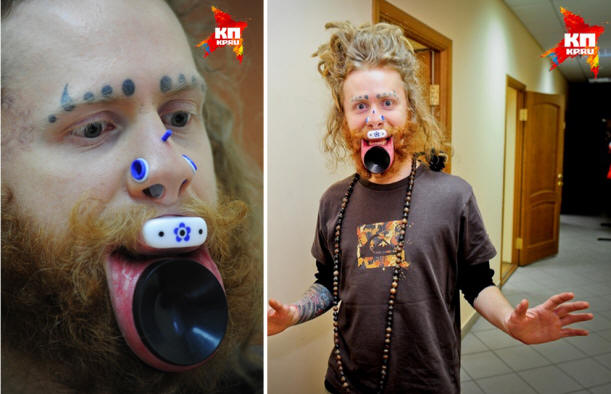 Jevgeny Bolotov on kehon modifioija, hän kokeilee ulkonäkö. Hänellä on levyt huulillaan, alaosa on venytetty 60 mm, yläosa 33 mm. Ja hän aikoo venyttää heidät “äärettömyyteen”. Hän venyttää ja korvakorut, teki tunneleita nenään ja nyt väliin jopa lyijykynä voi kulkea rauhallisesti sieraimien läpi. Hän lävisi myös nenän rusto, ja nyt hänen nenänsä taipuu, kuten plastiliini. ZhenYa erittäin ylpeä siitä, että hän on tällaisen lävistyksen ainoa omistaja planeetalla. – Ei, lapset eivät itke, – nauraa 27-vuotias Permi suunnittelija, – Ihmiset osoittavat toisinaan sormella, hymyilevät silmissä he pyytävät minua ottamaan kuvan heidän kanssaan. Totta, kaveri valittaa: sisään vaarallisilla Permin alueilla on kasvot joka tapauksessa sulkea. Vielä on epäselvää, kuinka oikeat pojat tapaavat, tervehtivät pimeä katu: kaikki Uralissa eivät ymmärrä ja hyväksy tätä “Beauty”.