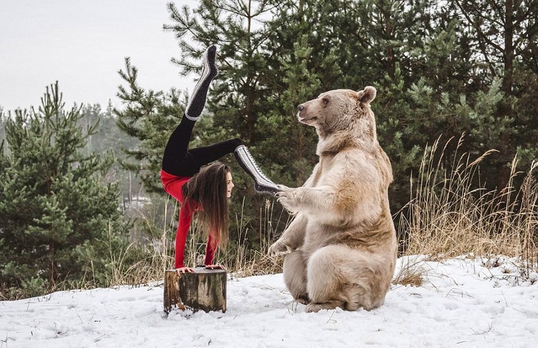 Olga Barantsevan mukaan karhu on yllättävä kaikille valokuvaajat, ei ollut ollenkaan aggressiivinen, mutta erittäin ystävällinen ja mukava. Hän ei vain nauttinut akrobaattisten harjoitusten suorittamisesta Stephanien kanssa numerot (soitettiin hänen kanssaan), mutta myös yhtä jännittämättä hän söi marjoja, tyttöystävänsä ehdottama hänelle, miksi ammunta oli hauskaa ja hauskaa. Ja vaikka tämän istunnon osanottajat aluksi varovaisesti kuvattiin villi karhu, lopulta heidän pelkonsa ja epäilynsä, miten he sanovat, vain kadonnut, jättäen tunne nykyisyydestä loma – lähestyvä uusi vuosi.