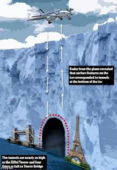 Kuvia avoimista lähteistä löytyneistä tunneleista, mukaan tutkijat päättyvät paikkaan, jossa mantereen jäätikkö menee vähitellen merelle ja missä kauan ruoppaaminen merenpohjassa. Seuraa tarkkaan alla olevia virtauksia jäähyllyt, tutkijat maksavat tällä hetkellä sillä, että heillä on avainasemassa jään sulamisessa. Tekijät löytöt korostavat muutosta tiedemiesten ymmärryksessä todellisesta rakenteesta Etelämantereen jäätiköt. Jäähylly käytettiin kelluvana suhteellisen ohut vesikerros, uusi tieto myös todistaa että jään alla oleva vesi ei ole ollenkaan vain passiivista kerros. Olisi tarkempaa pitää sitä aktiivisena välineenä, pesemällä omat kanavat ja tunnelit, kuten tavalliset joet tekevät.
