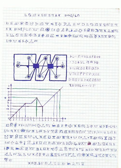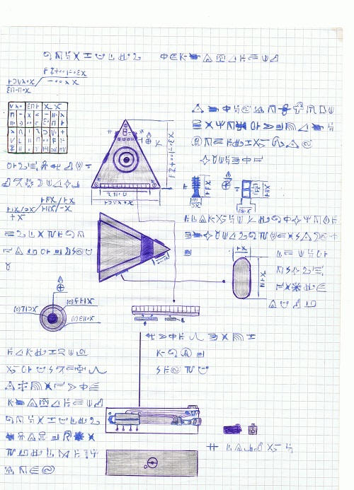 Oudot piirrokset, samankaltaisempia kuin piirustuksia. Vapaata tilaa paperille ottivat käsittämättömät kuvakkeet. Piirustukset jättivät vaikutelman jostakin merkityksellisestä, jolla selvästi oli asenne tieteeseen tai tekniikkaan. Kirjailija kirjoitti, että nämä piirustukset hän on jo kokonainen kasa.