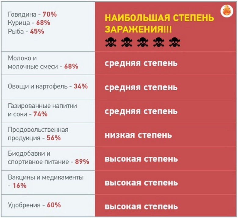 Huomaa, että Venäjän asettama elintarvikevientikielto USA, jostain syystä ei koske kalan, lihan tuontia tuotteet, välipalat pikaruokaravintolat, alkoholittomat juomia ja niin edelleen. Sama koskee lannoitteita, lääkkeitä ja joitain muita tuotteita, joiden kautta on niin helppo tartuttaa väestöstä. Katso näiden tuotteiden tuonti Yhdysvalloista vuodelle 2015 (vuonna 2006) prosenttia tuotujen kokonaismäärästä Tuote):