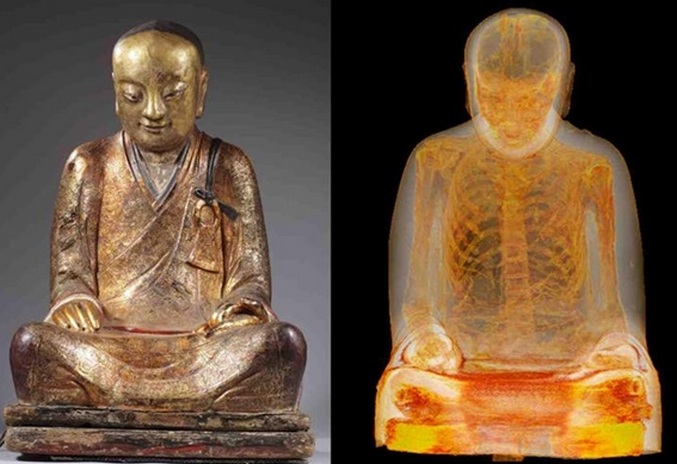 Tietokonetomografia ja endoskopia auttoivat keksintöä. patsaita. Jäännösten uskotaan kuuluvan Lee Kwanille, joka oli Kiinan meditaatiokoulun päällikkö. Itse muumiosta löydettiin vanhojen hieroglifien kanssa kirjoitetut paperinjätteet.