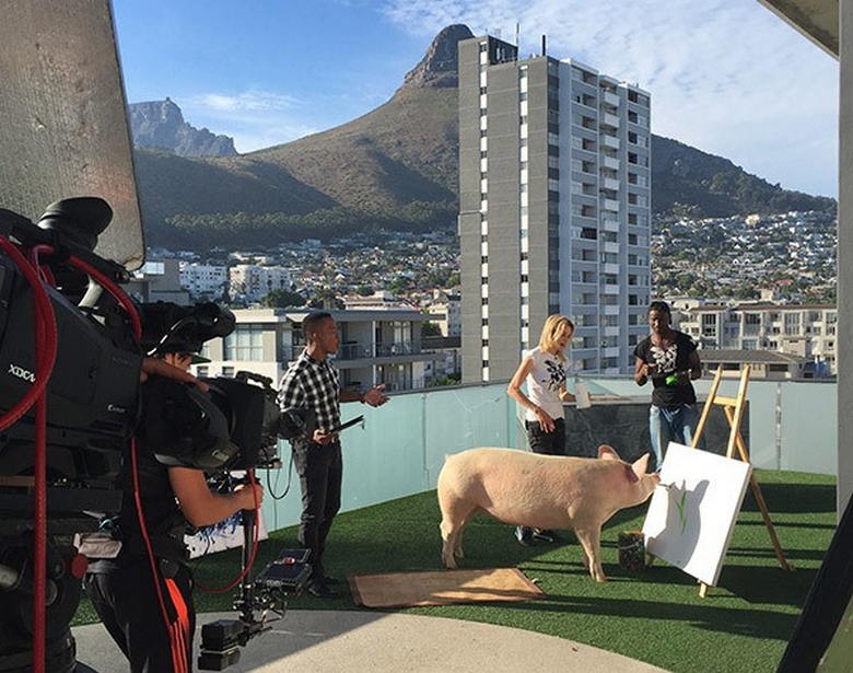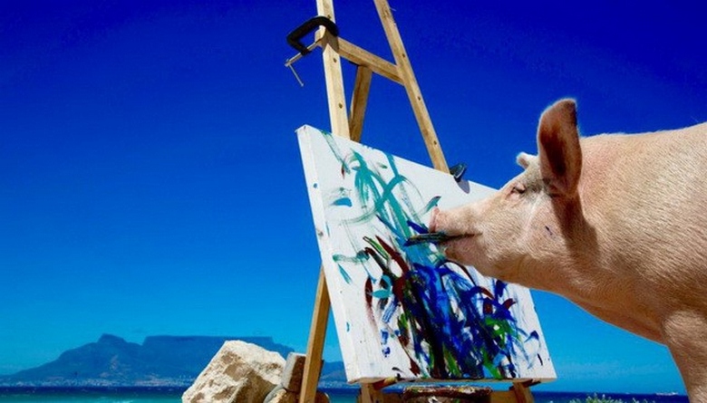 On sanottava, että Australian panda ei ole ainoa eläintaiteilija, Etelä-Afrikassa asuu tässä suhteessa yhtä lahjakas Pigcasso-sika, josta joku Joan Lefson pelasti kerran teurastamoissa ja yhtäkkiä … löysi hänestä ainutlaatuisen luovan viiran. Et tiedä kuka täällä on lahjakkaampaa – itse sika tai sen merirosvo Lefson, mutta tänään Pigkasso, taiteilijana (luonnollisesti tyylillä Picasso, hänen lempinimensä on sopusoinnussa tämän espanja-ranskan kanssa surrealisti), hänellä on oma Instagram-sivu, henkilökohtainen verkkosivusto, osallistuu jatkuvasti erilaisiin taidenäyttelyihin, ja hän maalauksia myydään jo 2 tuhatta dollaria voittaen vähitellen Kapkaupungin lisäksi myös Lontoo, Pariisi, Amsterdam, Berliini ja muut Euroopan pääkaupungit.