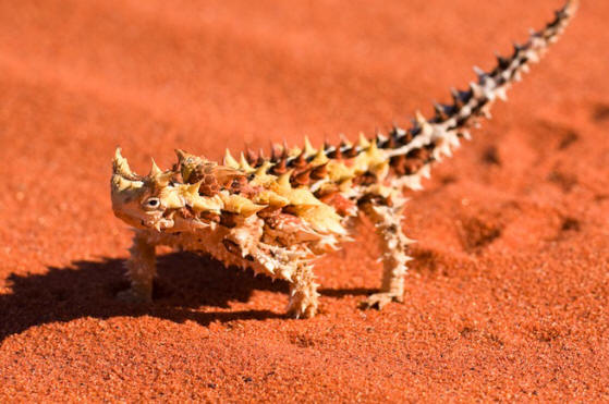 © sininen käsi | Shutterstock.com Thorny Devil tai Moloch Lizard (Moloch horridus). Tämän liskon takana olevat piikit, hyvin samanlaiset kuin lohikäärme, lisäksi oman puolustuksen käytetään kerätä ja säilyttää kosteutta (kaste) – kuivassa Australian ilmastossa, jossa liskoja asuvat tärkeä osa selviytymistä. Eläimet kasvavat jopa 20 senttimetriä kohti pituus ja elää jopa 20 vuotta, syö hyönteisiä.