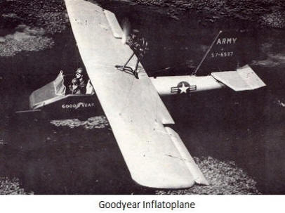 Vuonna 1959 Goodyear Tire rakensi puhallettavan lentokoneen. kaikki lentokone moottorilla ja kaapeleilla mahtuu 1,25 m: n säiliöön. cu. Kaksoistaso, joka on täytetty 5 minuutissa kompressorilla, ja yksi malli – polkupyöräpumpulla. Ajatuksella kehittäjille, Goodyear Inflatoplane piti olla väline pelastuslentäjät, jotka ammuttiin Vietnamissa ja kaatuivat alueelle, vietkongin hallitsema.