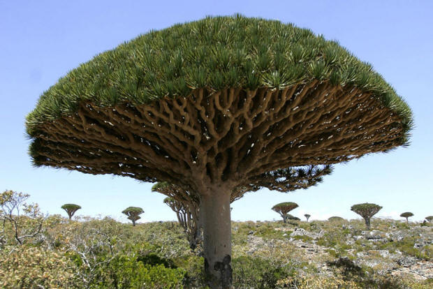 1. Dragon Blood Trees, tunnetaan paikallisesti nimellä Dam al-Akhawain tai kahden veljen veri Jemenin saarella Socotrassa, 27 Maaliskuu 2008. Arvostettu heidän punaisesta lääkemehustaan, veripuista Lohikäärme ovat silmiinpistävimmät 900 kasvilajeista Sokotran saaret Arabianmerellä, 380 km (238 mailia) etelään Jemenin mannerosa ja 80 km Afrikan sarven itäpuolella. (Reuters / Khaled Abdullah)