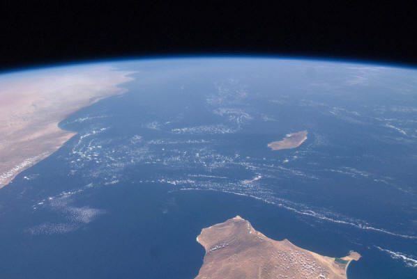 2. Socotra, näkymä kansainväliselle avaruusasemalle, 27. huhtikuuta 2012 vuosi. Vasemmalla Jemenin rannikko, itse asiassa Somalian kappeli Guardafuy, joka tunnetaan yleisesti nimellä Afrikan sarvi, oikealla keskellä – Sokotran saari. (NASA)