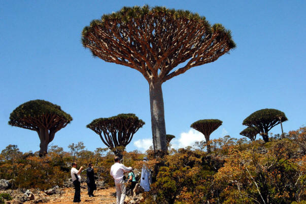 7. Jemeni ja ulkomaiset turistit kokoontuvat ihailla puun lohikäärmeverta Jemenin saarella Socotra, 27. maaliskuuta 2008. (Khaled Fazaa / AFP / Getty-kuvat)