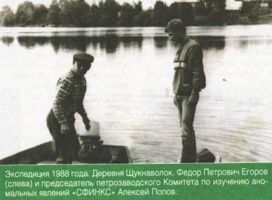 Karjalan Shchuknavolokin kylän asukkaat ovat jo pitkään levottaneet levottomuutta olento, joka asettui läheiseen lampiin Vedlozero. Kertoakseni kuuluisa karjalainen kansatutkija sopi tämän ilmiön historiasta, kirjailija ja matkustaja Aleksey POPOV. – Aleksei, mukana mikä aloitti tarinan omituisen olennon ilmestymisestä järveen? – Nauraat, mutta kaikki alkoi UFO: sta. Tarkemmin sanottuna lieriömäinen esine, joka on hiljainen syksyllä 1928, missään saapunut, törmäsi Vedlozeroon. Yleensä asiat sellaiset tapahtuu ilman todistajia, mutta tällä kertaa epätavallinen ilmiö havaittu viisikymmentä asukasta kylien Schuknavolok ja Vedlozero. – lähtien yli 85 vuotta on kulunut. Kuinka kuulit tästä tapaus? – Itse asiassa noiden vuosien tapahtumat tulivat tiedossa paikallisen asukkaan Fedor Petrovich Egorovin muistojen ansiosta, joiden kanssa minulla oli mahdollisuus kommunikoida nuoruudessani. Tuo vuosi hänelle se oli vasta yhdeksän vuotta vanha, mutta muisti säilytti kaiken selvästi yksityiskohdat uskomattomasta tapahtumasta. Luin sinulle otteen hänen muistelmat: “Tapauksesta tuli NKVD: n tiedossa ja käytännössä heti erityinen ryhmä saapui Schuknavolokiin. Tšekistit sopeutuivat tapahtuma-alue. Siksi kaikki pidettiin tiukassa luottamuksessa: kertaa tiedät itse mitä … tekniikoita oikein tarkastaa järven pohja, puhumattakaan siitä, että nostat esineen vedestä, ei Se oli. Oli vain tiedossa, että hän makaa noin seitsemänkymmentä senttimetriä järven pinnasta – pojat uivat sinne, ja kalastajat seisoivat sen päällä ja ottivat verkot pois. “- Eikö niin klassinen levy? – Ei, se oli metallisylinteri! Silminnäkijä kertoi, että 15. marraskuuta illalla hän ilmestyi metsän takaa valtava, rikkaan talonpojan talon koko, sileä sylinteri oikea muoto. Hän lensi kyläläisten yli hiljaa ja hyvin alhainen nopeus. Siihen mennessä Vedlozero oli jo peitetty jäällä. Esine mursi jään ja putosi veteen Shchuknavolokia vastapäätä. nouseva aalto tuhosi osan läheisestä saarekkeesta. Järven syvyys tässä paikalla seitsemän-kahdeksan metriä, ja pudonnut esine ei vain pudonnut ulos veden yli. Tämän takia paikallisten oli pakko siirtää kalaa Pysyn toisessa paikassa – verkot takertuvat sylinteriin. – jälkeen Onko näissä paikoissa tapahtunut jotain epätavallista? – C sylinteri on juuri alkanut! Viisi vuotta myöhemmin Shchuknavolokin kylässä käsittämättömiä asioita alkoi tapahtua. Esimerkiksi vuonna 1933 outo hyytelömäinen sade kaatoi kylän yli. Paikallisen neuvoa parantajien asukkaat keräsivät sen pullossa ja käyttivät lääketieteellinen voide. Sanottiin, että sotavuosina tämä lääke auttoi parantamaan vakavimmat haavat. Noin vuonna 1937 Vedlozeron vesi, sen saaren vieressä, jonka takana esine putosi, aika alkoi ilmestyä monivärisiä valoisia ympyröitä. Joskus he sykkivä, toisinaan pyörimässä näkymättömän keskuksen ympärille. Mutta eniten yllättävää, että näiden ympyröiden ulkonäkö vaikutti työhön Televisiot ja radio – voimakkaita häiriöitä esiintyi. – Kaikki tämä on hyvin mielenkiintoista, mutta mistä goblin tai vesi puhuu? Todistajat? – Tosiasia on, että samasta vuodesta 1933 lähtien, paikallinen asukkaat alkoivat tavata järven rannalla outoa olentomittaria kasvu – ohut, suurella päällä. Hänen ruumiinsa ja käsivarrensa olivat suhteettoman pitkät jalat päinvastoin ovat lyhyitä. Lakko, kuten kuvailtu, muistutti tiukasti istuvaa jumpsua. Olento yleensä istui hiljaisesti rannalla. Paikallinen ensin lapset heittivät kiviä häneen, sitten he tottuivat siihen. Lisäksi havainto tämä outo olento jatkuu tähän päivään asti! – Miksi käykö jotain? Se on melko vetistä. – Nimi ilmestyi valolla Leningradin tiedeyhdistyksen retkikunnan jäsenten kädet “Krytobiologia”, joka suoritti tutkimuksensa Vedlozeron alueella vuonna 1990. Sitten he etsivät isojalkaa ja löysivät Goblin. Kryptobiologien mukaan Karjalan kantapään silminnäkijät näki säännöllisesti kolmen metrin olentoja. Luokitellut kaiken havainnot, tutkijat päättivät, että heidän edessään kuvaus “Man luola”. Tai Bigfoot, kuten häntä kutsutaan suosittu tieteellinen kirjallisuus. Slaavilaisessa kansanperinteessä olento, jolla on sellaisia ”ominaisuuksia” kutsuttiin paholaiseksi. Tutkijat huomauttivat että aina maan luoteisosassa he havaitsivat lunta mies, hän ilmestyi juuri Karjalan alueelta!