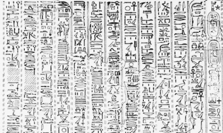 Valokuvia avoimista lähteistä, 13 pystysuoraa saraketta hieroglifisen tekstin sisältävän uskotaan nauhoittavan suurta hymni jumalalle Atonille. Tämä kirjoitus tuhoutui osittain vuonna 1890, kuitenkin kopion, jonka Urben Burian teki vuonna 2006 1883-1884 GG. Hieroglifien foneettisilla merkityksillä voit tutustu SS: ään. 51-53 Koparev E. A. Unohdettujen salauksen purku kirjallinen kieli. – P .: Verso, 2012.