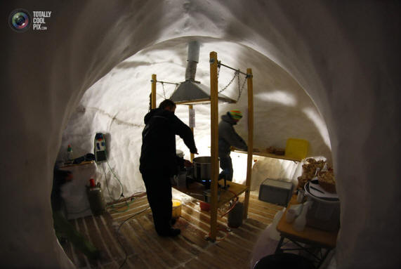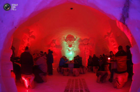 12. Ihmiset nauttivat juustofondüüsta iglu-ruokasalissa.