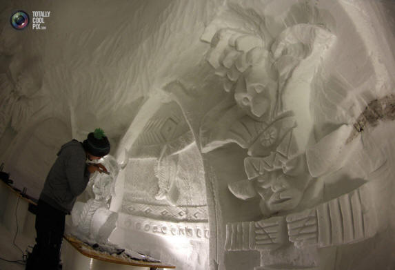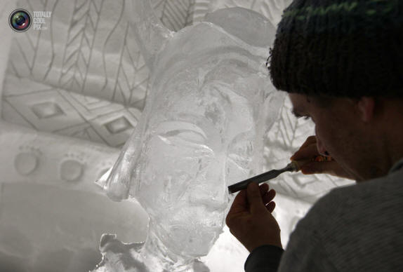 2. Työntekijä veistää jääveistoksia iglookylään Nebelhornin vuoren huipulla lähellä Oberstdorfia.