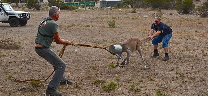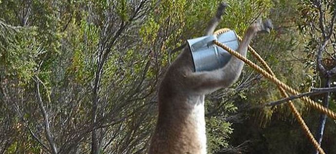 Meidän tapauksessamme kaksi miestä Steve Dew ja Rob Smith pelastavat eläimen, eikä vain eläin, vaan myös teini-ikäinen kenguru, joka koska tyhmä uteliaisuus tai janon takia takertuin pääni kastelukannuun, missä pää juuttui.