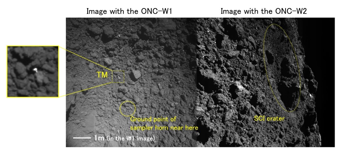 Video näyttää näytteenottoprosessin – laskeutumishetkestä – asteroidi näytteiden keräämiseen ja lataamiseen asti. Kraatteri, johon koetin laski, saatiin pudotetun pommin räjähdyksen seurauksena aikaisemmin avaruusaluksesta.