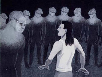 Yksi Jimin piirustuksista, jotka kuvaavat hänen tapaamistaan ulkomaalaisia Kaikki alkoi noin 3:30 aamulla. Heräsin matala, sumiseva ääni. Samalla imin lusikan alla sydämeni alkoi lyödä nopeammin ja pääni väänsi. Pian äänimerkki muuttui ulvoksi, ja ääni tuli kõrvettavan kovaa. Se näytti halvaannuttavan minua, jouduin pyörtymiseen. ja yhtäkkiä tunsin itseni nousevan sängyn yläpuolelle, näin sen Lähestyn seinää, josta tulee läpinäkyvä, katoaa ja minä “uida” sen läpi. Sitten mieleni sammuni kokonaan. Herääessään huomasin olevani 35 metriä maanpinnan yläpuolella ja hitaasti Minä menen alas. Minun alla oli hylätty huvipuisto. Olen lensi suurten venäläisten diojen yli “ja en pelkää Tunsin olevani rauhallinen ja rento, ja lento jopa toimitettu Olen tyytyväinen. Pian olin seitsemän-kahdeksan metrin päässä maasta, ruumiini otti pystyasennon ja alkoi heilua, kuin heiluri. Sitten näin noin tusinan suuret ääriviivat olentoja seisoo puoliympyrässä. Ja vaikka ei ollut vielä aamunkoitto, tutkin: ne olivat humanoideja, vain erittäin suuria. Joissakin hetki, jolloin menetin tajunnan uudelleen. Alien Circle tulossa löysin itseni seisovan kahdentoista humanoidin joukossa, asettui maahan melkein noidankehässä. Heidän kasvu saavutettiin kaksi metriä, ja he kaikki katsoivat yhtä seisovan vasemmalla puolellani. Ainoa valonlähde oli tämän muukalaisen kasvot, muistuttavat ihmisen kasvojen kirkkaasti hehkuvaa hologrammaa, hänen fysiologiansa päälle. Tämä tehtiin todennäköisesti järjestyksessä piilottaakseni sen todellisen ulkonäön. Mutta kun ulkomaalainen avasi suunsa, ääniä ei kuultu, mutta äänen, että minä telepaattisesti havaittu, ei ollut samaa mieltä huulten liikkeestä.