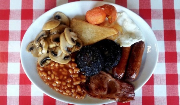 Brittiläisillä on aamiainen myöhään, mutta perusteellisesti. Tällä hetkellä he syö munia, pekonia, sieniä, mustaa vanukkaa, papuja, tomaattia, makkaraa ja paahtoleipää.