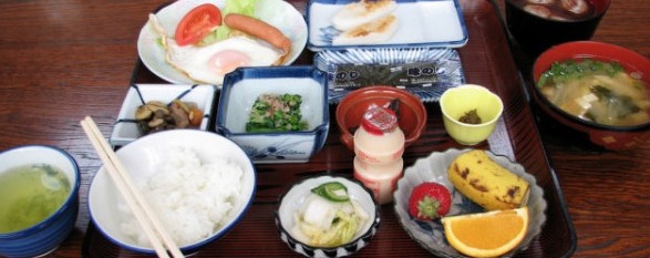 Japanilainen aamiainen tulisi jakaa perinteiseen (miso keitto, riisi, nori merilevää) ja länsimaisia (kahvi, munat, paahtovoi voilla, peruna salaatti).