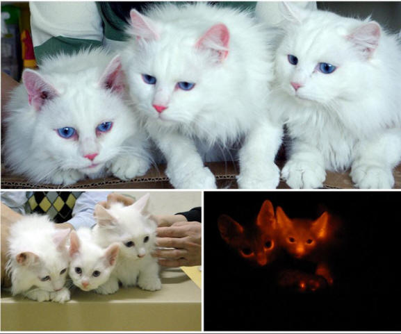 2. Nämä lumivalkoiset kissanpennut ovat Etelä-Korean geneetikkojen työtä. Tutkijaryhmä loi kolme kissan kloonia modifioidulla DNA: lla. Näiden eläinten iho hehkuu punaisena vaikutuksen alaisena ultraviolettisäteet. Korean tutkijat uskovat, että heidän työ auttaa ihmisten geneettisten sairauksien ja eläimiä.