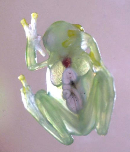 Фотоavoimista lähteistä Näytelmältään nämä sammakot eivät eroa toisistaan toiset (vihreät ja isoilla silmillä), kunnes katsot häntä vatsaan. Sen kautta voit nähdä sisäelimet täydellisesti sammakot – maksa, sydän, maha-suolikanava ja joskus jopa munat naisilla. Бабочка Грета Ото
