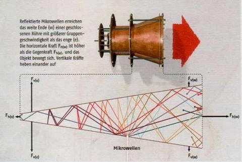 Teoreettinen peruste tällaisen moottorin luomiseksi kuuluu Brittiläinen keksijä Roger Scheuer. Vuonna 2006 hän rakensi kokeellinen malli. Himo 16 pl. (mikäwton) luotu mikroaallot värähtelevät tyhjiösäiliön ympärillä. Mikroaaltojen luomiseen tarvittava sähköenergia tuotetut aurinkopaneelit. Keksijä soitti autolleen EmDrive.