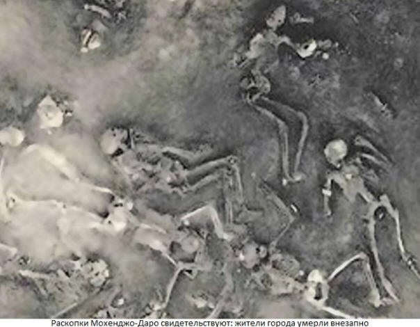 Mohenjo-Daron raunioista löytyi kymmenien radioaktiivisuus luurankot ylittävät normin 50 kertaa! Niin kutsuttu niin kutsuttu hajallaan ympäri kaupunkia tektiitit ovat sintratun hiekan kappaleita lasimassassa. (1900-luvulla kun tektiittejä alkoi löytää massiivisesti ydintestauskohteista, ihmiskunta on paljastanut heidän alkuperäsalaisuutensa.)