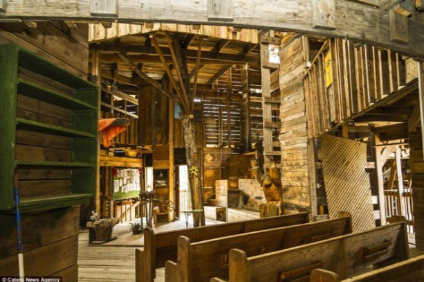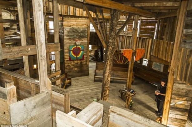 Kuva avoimista lähteistä Valtava puutalo colosal pinta-ala 10 000 neliöjalkaa (3 400 neliömetriä) Horace on erittäin halpaa. Hän käytti vain 12 tuhatta dollaria kiitos materiaalien taloudellinen käyttö ja jätteiden käyttö tuotantoon. Talon sisällä kierreportaat, alttari, koripallo leikkipaikka ja monia huoneita, käytäviä, käytäviä ja parvekkeita.