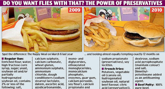 Vuonna 1996 terveellisen ravinnon konsultti Karen Harahan aloitti kokeilun: kuinka kauan, ilman pilaantumista, voidaan selviytyä hampurilainen mcdonaldsilta. Se osoittautui olevan vähintään 12-vuotias. Tänä aikana hampurilainen ei ollut ollenkaan huono. Yhdysvalloissa monet ryntäsivät toistamaan tämä kokeilu. Heidän joukossaan on valokuvaaja Sally Davis. 15. joulukuuta hänet Hampurilainen sai 979 päivää vanhaksi – ja hän on edelleen hieno. päälle Yllä oleva kuva näyttää Harakhan-kokeilun tuloksen – juuri vasemmalle osti hampurilaisen McDonaldsilta oikealta – joka on 12 vuotta vanha. varten tällä kertaa tuote ei mäntynyt, ei muuttunut homeiseksi, vaan vain kuivui Pohjan tila on pulla, naudanlihan kotletti. Harahan kuten terveellinen ravitsemusterapeutti vaatii ikuista hampurilaista tulee, koska se on täynnä säilöntäaineita ja suolaa. Kun sisään 2008, nämä tulokset näyttivät, monet amerikkalaiset kiirehtivät Suorita sama kokeilu. Heidän joukossaan valokuvaaja New Yorkista Sally Davis. Hän jopa monimutkaisti kokemusta lisäämällä hampurilaan vakio-osa ranskalaisia. Davis-kokeen tulos ottaa kuvia joka viikko ja lataa kuvia sivulleen flickrissä. 15. joulukuuta 2012 hänen hampurilainen ja laukku perunaa täyttyi 979 päivää, ja molemmat tuotteet ovat edelleen täydellisessä kunnossa! Niissä ei ole merkkejä mätää tai homeesta, ainoa muutos sen jälkeen tällä kertaa – ne ovat kuihtuneet huomattavasti, muuttumassa melkein kivi: