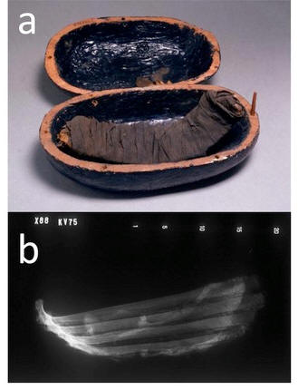 Mumifioituneet lihapalot ovat ainutlaatuinen löytö tiede, koska jotkut tapaukset liittyvät suunnilleen 3300 eaa Esimerkiksi kuuluisa faarao Tutankhamun meni hänen viimeiseen suojiaan, mukana 48 muumioittua astiaa naudanlihasta ja siipikarjasta. Tutkijat päättivät selvittää, olivatko menetelmät erilaisia “muumioiden lihan” muumifikaatio siitä, kuinka egyptiläiset muumioivat ihmiset tai lemmikit. Tätä varten he opiskelivat huolellisesti neljää näyte lihasta, joka on arkistoitu Kairossa ja Ison-Britannian museoissa. Vanhin oli haudasta otettu kylkiluu. Tii (egyptiläisen faaraon Amenhotep III vaimo). Tämän muumioituminen naudanliha juontaa juurensa 1386 eKr Toinen vasikanlihan näyte, löytyi Thebesin ylimmän papin sisaren ja vaimon haudasta, juontaa juurensa vuoteen 1064 eKr Ja kaksi viimeistä näytettä (vuohi ja ankka) liha), joka on saatu papin haudasta, joka kuoli noin 1290 eaa BC Tutkijat päättivät suorittaa paitsi lihan perusteellisen analyysin myös tutkia siteiden kyllästämisen kemiallista koostumusta. Seurauksena he havaitsi, että eläinrasvat eivät ole itse lihassa, vaan sen päällä siteillä, todennäköisesti palvellakseen ylimääräinen säilöntäaine. Kuitenkin mielenkiintoisin kemikaali analyysi osoitti vasikanlihaa. Tämän muumion siteet sisältävät jäämiä monimutkainen balsami, joka on valmistettu Pistacia-puun rasvasta ja hartsista. Tämä hartsi oli ylellinen esine muinaisessa Egyptissä ja käytetään kalliina suitsukkeena sekä lakkina korkealaatuiset arkut. Sitä ei kuitenkaan käytetty ihmisten mumifikaatio …