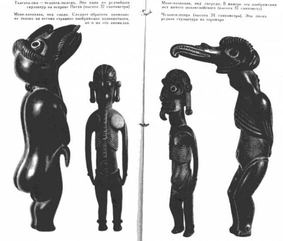 Nykyaikaiset tutkijat myös rakentavat vain versioita jättiläisestä patsaita “, joista koko pankissa on kohtuullinen määrä; ne (saarilaiset) pakkoutuvat itsensä edessä ja suorittavat rukouksia. Kaikki nämä epäjumalat, jotka on kaiverrettu kivistä ihmisinä, joilla on pitkät korvat kruunatut kruunu, kaikki tämä leikataan sellaisella taiteella, että me se vain hämmästyi.