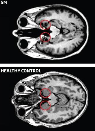 valokuva avoimen lähdekoodin SM herätti tutkijoiden huomion, kun koputti laboratorion neurologi Daniel Tranela yliopistosta Iowan osavaltio (USA) 1980-luvun puolivälissä. Hänet juuri toimitettiin Urbach-Vite-taudin diagnoosi. Tämä on geneettinen häiriö niin harvinaista, että nykyään tunnetaan vähemmän kuin kolmesataa tapauksissa. Oireita ovat ihovauriot ja kalsiumpitoisuudet. aivoissa. SM: ssä tauti tuhosi molemmat amygdala. “Niin paljon paikallinen vaurio on erittäin harvinainen, – toteaa neurotieteilijä Daniel Kennedy Indianan yliopistosta (USA). ”Tällaisia tapauksia on vain muutama tusina.” Nähdessään tämän, herra Tranel tajusi, että hänellä oli ainutlaatuinen mahdollisuus tutkia tämän alueen toimintoja aivot. Amygdala (yksi jokaisessa pallonpuoliskossa) pelaa tärkeä rooli tunteiden, etenkin pelon, muodostumisessa. Se on pitkä aika tiedossa, mutta yksityiskohdat ovat sumuisia. Erityisesti tutkijat eivät voi vielä sano kuinka paljon amygdalaa tarvitaan pelkoon, toteaa Mike Koenigs Wisconsinin yliopiston Madisonista (USA). Ehkä amygdala-aktiivisuus on rekisteröity tomografilla, on vain seurausta muilla alueilla harjoitetusta toiminnasta aivot. Vaikuttaa siltä, että SM: n tapaus sulki pois tämän mahdollisuuden, koska yhdessä amygdala-hoidon kanssa hänen pelkonsa katosi kokonaan kun taas loppuosa tunnepaletista ei ole käynyt läpi muuttuu. Samalla hän oli erittäin vilkas. voida sanoa tietyssä mielessä, että hän jahtaa uusia sensaatioita. Kerran tutkijat kutsuivat hänet ravintolaan, jossa hän nautti jutteli tarjoilijan kanssa ja seuraavana päivänä pyysi viettämään hänet samassa paikassa. Nähdessään saman tarjoilijan, hän oli huomattavasti iloinen ja oli erittäin ystävällinen hänen kanssaan. Tämä on merkki siitä, päinvastoin useimmista muista ihmisistä SM ei pysty tunnistamaan tuskin havaittavissa olevat vinkit, jotka saavat meidät käyttäytymään hillittyä tietyissä tilanteissa. “Ihmiset sinä ja minä ajattelemme tummia ihmisiä, hän kutsuisi luotettaviksi, – sanoo herra Kennedy. – Hän on puolueellinen ihmisiin siinä että hän haluaa päästä lähemmäksi kaikkia. “Ilmeisesti amygdala elimet ovat vastuussa pelkäämästä tunneta, mutta myös joistakin sosiaalisen käyttäytymisen näkökohdat. Herra Kennedy tarkisti äskettäin tutkinnon SM: n avoimuus esimerkki hänen henkilökohtaisen tilan tunteestaan. Hän kysyi naiset lähestyivät hitaasti SM: tä, ja sen oli tarkoitus antaa merkki, kun hän alkaa tuntea epämukavuutta. Tämä raja sijaitsee 0,34 m päässä siitä, eli melkein kaksi kertaa niin lähellä kuin muut kokeilun osallistujat. Lisäksi kävi ilmi, että SM ei ole kykenevä lukea ilmeitä, mutta ei osaa valita: hän näkee iloa ja surua, mutta pelkoa ei voida määritellä. Ja tämä alitajunnan reaktio: pelon tai vihan vääristämät henkilöt, ilmeettömien kasvojen väliin ilmestyi näyttö on vain 40 ms, ja SM: n piti painaa painiketta kuten voi olla nopeampi henkilön silmissä, joka ilmaisee pelkoa kuin vihaa. C Hän suoritti tämän tehtävän aivan samalla tavalla kuin muut. mutta kun hänelle annettiin rajaton aika ajatella, hänestä tuli tehdä virhe. Kaivoen syvemmälle, herra Kennedy huomasi ongelman olevan kuinka aivot ohjaavat hänen katseensa. SM ei vain katso silmiin ihmiset, kun heistä luetaan pelko, eli kun ne laajenevat. Kun hänet asetettiin sellaisiin olosuhteisiin, että hän ei voinut muuta kuin katsoa silmiin, hän alkoi usein tunnistaa oikein pelättyjen ihmisten kasvot. Siksi amygdala ei ole vain “ilmaisin” vaara. “Vaara näyttää olevan muiden tallentaman. aivojen alueet ja amygdala tämän työn tulosten mukaan saada huomio keräämään kriittistä tietoa vaaran aste. Tuloksena on pelon tunne. koska amygdala puuttui SM: stä, hän vain tunsi jännitys on samanlainen kuin jännityksen tunne, mutta ei pelkoa. Tämä selittää että hän ei ollut lemmikkikaupassa ja “kummitetussa talossa” välinpitämätön, kuten voisi odottaa pelottomalta henkilö. Mutta herra Feinstein nukkui tuhosi tämän harmonisen teorian. Hänelle lopulta onnistui pelottamaan huono asia. Yhdessä kokeilussa häntä yhdistivät kaksoset AM ja BG samoilla vammoilla amygdala. Herra Feinstein kääntyi klassiseen testiin paniikki: pyydettiin osallistujia käyttämään ruokittuja naamioita ilma, jonka hiilidioksidipitoisuus on 35 prosenttia. Suurimmalle osalle terveillä ihmisillä hengenahdistus alkaa heti, kiihtyy sydämentykytys, hikeä ilmenee, huimausta. Noin neljäsosa paniikkia. Kummallista, mutta kaikki kolme selvisivät myös paniikista. SMheilutti kätensä osoittaen naamiota ja huusi: “Apua!” kun naamio poistettiin, hän sanoi: “Paniikkiin, koska helvetti ei ymmärtänyt mitä tapahtui. “Hän koki ensimmäisen kerran sairauden alkamisen jälkeen pelko. Kaksi muuta reagoivat melkein samalla tavalla. AMHän virnisti ja puristi vasemman kätensä nyrkkiin yrittäen vapauttaa itsensä. päälle hän sanoi, hän pelkäsi tukehtumistaan ja huomasi, että se oli kauhein hetki hänen elämässään. BG alkoi ruiskuttaa ilmaa ja hän repi naamion myöntäen myöhemmin, että hän tunsi jotain täysin uusi on lähellä olevan kuoleman pelko. Tämän jälkeen herra Feinstein ei tiennyt mitä ajatella. Vuosikymmenien ajan pari amygdalaa aivot kuvattiin pelon keskukseksi, ja se näytti luonnolliselta heidän poissa ollessaan henkilö tulee epätoivoisesti rohkeaksi. Kuitenkin tiedemies pian tuli siihen johtopäätökseen, että vanha teoria ei ole niin väärä. Ilmeisesti aivot käsittelevät uhkia eri tavalla sisältäpäin. (astma, sydänkohtaus jne.). “Tämä on ensisijainen kerros, pohja pelon muodossa “, korostaa herra Feinstein. Itse asiassa se ei ole miksi kiinnittää huomiota ja arvioida ympäristön tilaa: korkea hiilidioksidipitoisuus hengitetyssä ilmassa – johtaa suoraan veren happamuuden muutokseen, – johtaen reaktioiden kaskadiin aivoiss