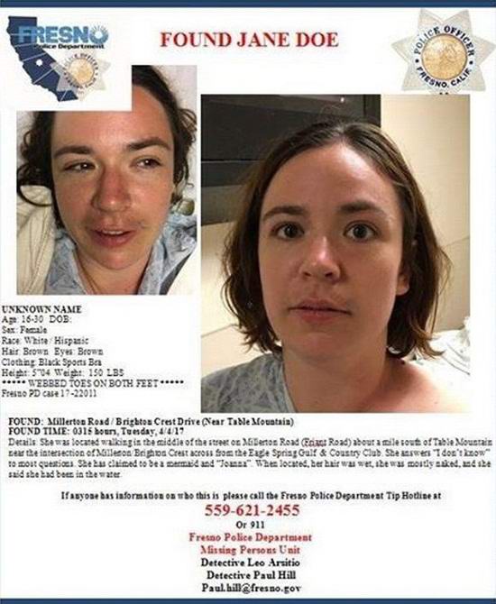 Jane Doe (sellainen nimi Yhdysvalloissa annetaan kaikille tuntemattomille reilumpi sukupuoli) puhui vähän englantia ja kuului muille varoen. Hän kertoi vain siitä itsestään väitettiin olevan todellinen merenneito, joka asui ensin vedessä ja sitten oli hänen tahtoaan vastaan maalla.