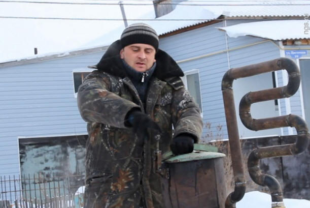 Kuva Open Source “Joten osoittautuu korkeaksi lämpötiloksi kemiallinen reaktio – pyrolyysi. Näet, että hiilet palavat, – osoittaa Omsk reikällä, jonka halkaisija on noin 10 cm – osoittautuu, että vety ja hiilimonoksidia, ja palamisen jälkeen hiilidioksidi poistuu pakoputkesta kaasu ja vesihöyry. Itse asiassa tämä on ekologinen auto: se ei vahingoita silmiäsi, se on erityinen ei hajua. Lieden sytyttämiseksi sinun on avattava punaiset hanat, sisään aseta tuulettimen reikä, täytä polttoaine ja aseta se tuleen. ”