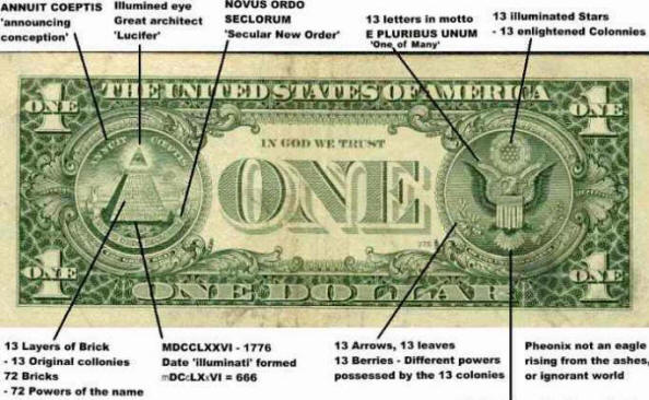 Lisäksi natsit ja Neuvostoliiton symbolit: svastika siirtyi salaisista seurakunnista seteleiksi Venäjän väliaikainen hallitus, annettu kevääseen 1918 saakka vuosia, ja sitten sitä käytettiin Puna-armeijan tunnuksen suunnittelussa. ja vaikka hän ei juurtunut meihin, hänestä tuli tunnetuksi virkamiehenä symboli NSDAP, Toisaalta, tunnettu viiden terävä 20-luvun alkupuolella sisustetut tähdet paitsi budenovki ja Puna-armeijan liput, mutta myös Hitlerin hyökkäyskoneiden univormut, yllään pentagrammi vaatteidensa kääreillä. Tämä on todennäköisesti selittää sen, että selkeistä eroista huolimatta ideologia, saksalaiseen hyökkäykseen Neuvostoliittoa vastaan maassamme Saksan armeijan asiantuntijoita koulutettiin, valmistettiin laitteet Wehrmachtin tarpeisiin jne., koska niitä oli mukana täysin erilainen, ei tavoitettavissa tahattomille periaatteet, päämäärät ja tavoitteet. Vapaamuurarit heijastuvat täydellisimmin löysi symbolismin Yhdysvalloissa, joista 1900-luvun alussa oli tullut keskus maailmanlaajuinen pääoman keskittyminen. Setelin takana Yhdysvaltain varapresidentti Henry tilasi yhden dollarin Wallace venäläisen emigrantin teosofi Sergei Makronovsky (aka – Nikolai Konstantinovich Kerich) ja otettiin liikkeeseen 30-luvun lopulla vuosina, on olemassa koko joukko vapaamuurarien merkkejä ja symboleja, ja ennenkin numeron 13 täydellinen ärsyttävä toisto, joka opin mukaan on Kabbalah tarkoittaa 13 aloitusastetta. Kapeassa mielessä kolmetoista – tämä on energian ja ihmisen muutoksen kehitysasteiden lukumäärä. Laajemmassa merkityksessä kolmetoista toimii epätäydellisyyden symbolina tietty maailma ihmisiä johtaa maailmaa ja sen tarvetta, “huippu”, koska vain tämän supervallan avulla hän hyötyy eheys ja välttää vaaraa, jota numero myös symboloi 13. Laskun vasemmassa nurkassa on teksti “The greal seal” (“Great sinetti “) vapaamuurarien katkaistun pyramidin kuva on sijoitettu, koostuu kolmestatoista tiilikerroksesta, joissa jokainen tiili tarkoittaa yksittäistä kansakuntaa tai valtiota kolikollaan, symboloi kaikkien hierarkiassa järjestettyjen maailman rahan yhtenäisyyttä, jonka määrittelee pyramidin yläosa – valoisa vapaamuurari kolmio maailmankaikkeuden suuren arkkitehdin silmällä. Tämä symboli kruunattiin latinalaisella kirjoituksella ANNUT COEPTIS, joka koostui kolmestatoista kirjeitä ja edustavat Virgilin vääristynyttä lainausta: “Ole suosii rohkeita yrityksiä “, mikä on yksiselitteinen korostaa, että vain “valittu” on ennalta määrätty hallitsemaan maailmaa. Katkaistu pyramidi on vapaamuurarien merkki “vapaiden muurareiden” perustama maailmanjärjestys, joka ilmaisee siten ajatus siitä, että vapaamuurarius on ennalta määrätty päätöksen roolista klaani. Tämä löytää jälleen vahvistuksen kirjoituksessa Latinalainen: NOVUS ORDO SECLORUM, joka sijaitsee välillä pyramidin pohja ja kirjoitus “Suuri sinetti”. Hänen käännös puhuu tietystä “Uudesta ikäjärjestyksestä”. Laskun oikealla puolella kuvaa kotkaa, jolla on kilpi, jolla on kolmetoista raitaa (kevyt ja tumma). Lisäksi yllättäen oikeassa käpälässään hän pitää akaasiahaara, jossa on kolmetoista lehteä ja kolmetoista silmua kukkivat kukat. Mutta akaasia, kuten tiedätte, ei ole vain vapaamuurariuden pyhä puu, jonka avulla voit avata Hiramin haudan, mutta symboloi myös vapaamuurarien perinteitä ja organisaatiota, salaisen tiedon hallussapito, kyky nousta ylös tai kuolemattomuus. Vasemmassa taskussa kotka pitää nippu 13 nuolet, symbolisoi tietoa ja voimaa, joka on suunniteltu rauhoittumaan ja milloin tarvitse ja tuhoa viholliset, joten ihannetapauksessa kukin kolmetoista nuolta uhkaa yhden kolmestatoista kerrosta muodostumista orjuutettujen ihmiskunnan pyramidi. Laajemmin nuolet personoida menestys, jonka tulisi seurata edistystä kohti maailman korkein tavoite “Uusi ikäjärjestys”. Nokissa kotka pitää nauha, jossa on jälleen perinteinen vapaamuurarien iskulause, jossa on 13 kirjainta: “E PLURIBUS UNUM “(” Monista yhdestä “), vapaamuurarien mukaan oppi, joka perustuu muinaisiin materialistisiin opetuksiin maailman alkuperä, ja alku oli vain “Yksi”, joka myöhemmin hajosi ja hajoaa edelleen toistaiseksi “Moniksi” erilaisia olentoja, esineitä, ilmiöitä, lajeja, luokkia jne. Siksi ihanteellinen tavoite on tuhota monet, poistaa ihmisille, heidän perinteilleen ja kulttuurilleen ominaisen monimuotoisuuden rikkaus, päivitetyn version palauttamisen vuoksi.