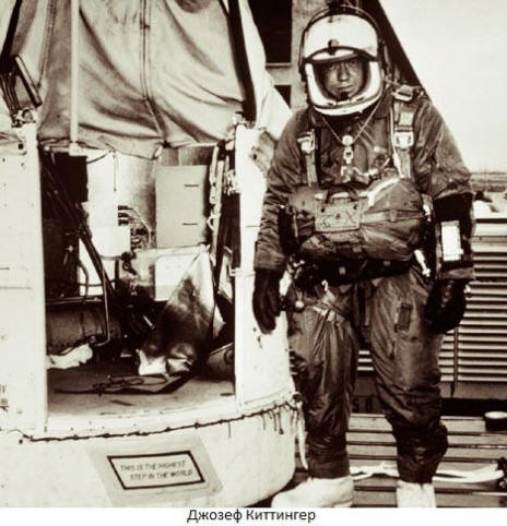 Neuvostoliiton kosmonautian perustaja S. Korolev käsitteli myös astronautin palattuaan Maahan jälkeen -ongelmaa tieteellisen ohjelman toteuttaminen. Ei riitä, että lähetät henkilön tilaa, sinun täytyy palauttaa se! Ensimmäiset astronautit palasivat takaisin lasketut kapselit. Ja jos onnettomuus? Mitä sitten? Onko se totta tässä tapaus päästä pois laitteesta ja laskeutua laskuvarjolla maahan? Kysymykset Yli 4000 metrin korkeudessa se putoaa huomattavasti prosenttinen hapen osuus ilmakehästä. Hapen takia 30 -60 sekunnin nälänhäiriön jälkeen “aktiivinen tietoisuus” sammuu ja ratkaisemaan yksinkertaisin palapeli (kuten “vie pois vuodelta”) syntymä 20 “) on tehtävä uskomattomia henkisiä ponnisteluja. Muutaman ensimmäisen minuutin aikana astronautti putoaa käsittämättömänä nopeus. Kuinka hänen ruumiinsa käyttäytyy tässä tapauksessa? vapaasti putoava runko lämpenee korkeisiin lämpötiloihin. hävittää mallinuket löydettiin hiiltyneillä raajoilla, ilman nenää ja ilman korvia. Suojaako puku? Ja jos astronautti putoaa korkkiruuvi? Kun pyörii yli 140 rpm, aivot erotetaan selkäydin ja kaivaa kallon yläosaan. Avaa silmäni Minun piti avata silmäluomet sormella. Kun testataan sentrifugissa Joissakin lentäjissä tällainen määrä verta ryntäsi päähän verisuonet räjähti. He kutsuivat tätä “punaiseksi verhoksi” tätä ehtoa. Kestääkö henkilö tulevia ylikuormituksia? Oli vain yksi tapa saada vastaus kaikkiin näihin kysymyksiin – tarkista käytännössä. Joseph Kittingerin hypätä 50-luvun lopulla Yhdysvalloissa Excelsior-projekti turvallisen laskuvarjojärjestelmän luomiseksi korkeille korkeuksille lentäville lentäjille.