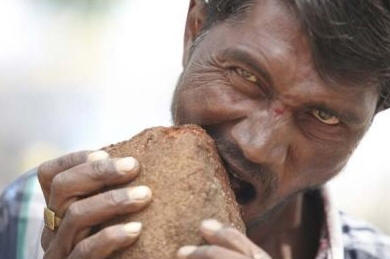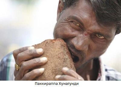 30-vuotias intialainen Pacquirappa Hunagundi on syönyt yli 20 vuotta kivet, hiekka, metalli ja vain maa. “Tuotteet” ottaa vastaan rakennustyömaille, joissa työntekijä työskentelee. Joka päivä syö ainakin 3 kg, pese alas lasillisella vettä. Äidin vakuuttamiseen vastaa, että kivet ovat paljon maukkaampia kuin jopa paistettu kana, eikä niiden kieltäminen ole menossa. Lääkäreiden yllätykseksi, on terveellinen ruoansulatuskanava järjestelmä ja aivan täydelliset hampaat. Äskettäin Pakkirappa alkoi miettiä pop-taiteilijan uraa ja suunnittelee jo kiertäminen maassa. Syön kaiken!