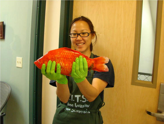 Kalifornian (USA) Tahoe-järven syvyyksistä löysi uuden upea näkymä – jättiläinen kultakala. Etsimässä tunkeutuvaa tästä järvestä löytyneet kalalajit (ihmisten vahingossa tuomat) tutkijat puoli metriä pitkä ja kaksi kiloa painava kultakala.