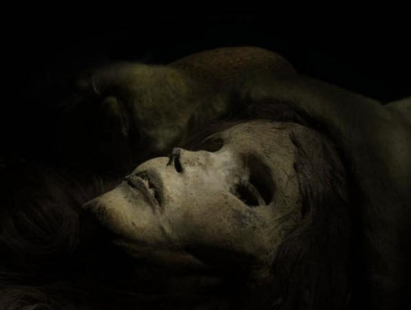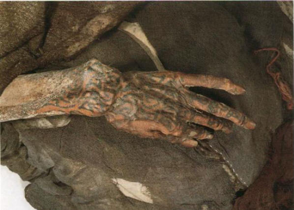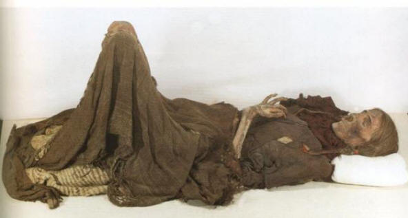 Hänellä oli purppurapunainen kaapu, ja lähellä makasi vähintään 10 erilaisia tyylejä hattuja. Kuten tšetšeenin mies yhden naispuolisen muumion kasvoilla oli monia tatuointeja. nainen 6 jalkaa pitkä ja vaaleanruskeat hiukset punottu kahdeksi pitkät punokset, yllään punainen mekko ja valkoiset saappaat buckskin.
