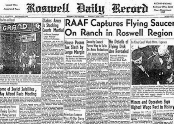 Sanomalehti, jossa on viesti alla olevan “levyn” kaatumisesta Roswell