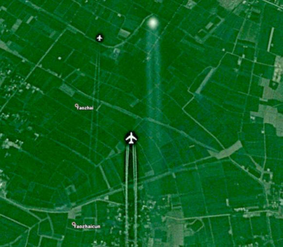 Scott Waring raportoi omituisesta kuvasta, joka löydettiin yhdestä Google Mapsista Kiinan alueen yli. Niitä on kaksi lentokone ja jotkut valkoiset pyöristetyt esineet.