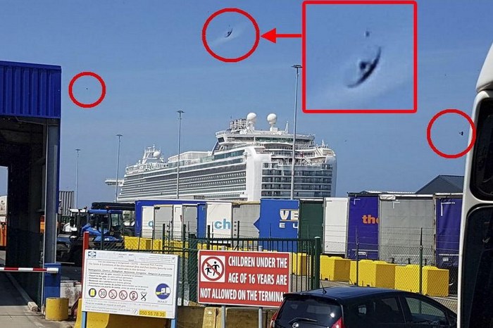 Näin tapahtui Belgiassa Zeebruggen satamakaupassa. brittiläinen turisti, joka tekee eurooppalaisen risteilyn Southamptonista Zeebruggeen, ottaen vahingossa kiinni otettaessa kuvia satamasta nähtävyyksien linja-ikkunasta älypuhelimesi linssissä “lentävä lautanen”, joka roikkuu (tai lentävät) vuorauksen yli.