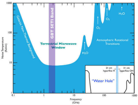 Taajuusalue, jolla “maan ulkopuoliset metsästäjät työskentelevät mielessä “, sisältää niin sanotun” vesireiän “taajuuksilla, vety- ja hydroksyyliryhmän säteilylle ominaista (kuva Kalifornian yliopisto, Berkeley).