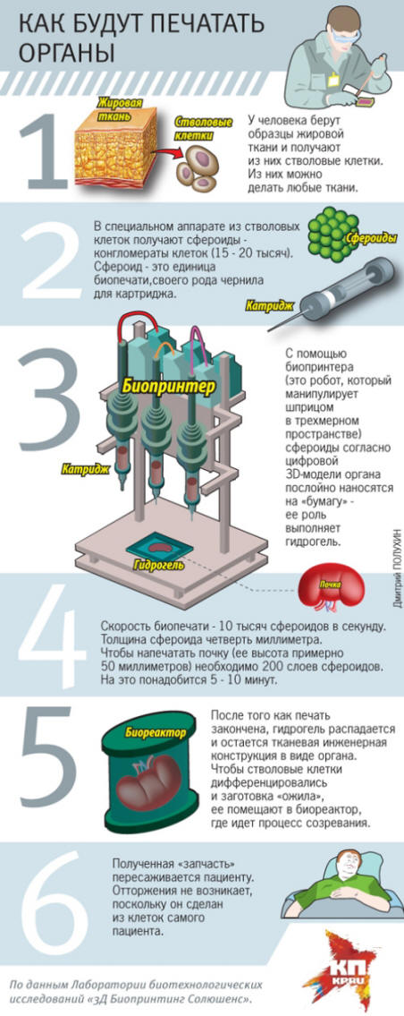 Maailman ensimmäinen elävä urut tulostetaan Venäjällä 15. maaliskuuta 2015 vuosi. Tämän totesi Venäjän päällikkö Vladimir Mironov Biotekniikan tutkimuslaboratorio “3D Bioprinting Solutions “, professori Virginian yliopistosta (USA). Kirjailija sensaatio kertoi “Komsomolskaya Pravda” uuden fantastisista mahdollisuuksista teknologiaa.