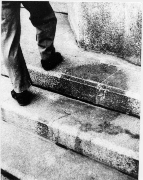 Varjosta mies, joka istuu portailla räjähdyksen aikaan ennen saapumistaan pankkiin, 250 metrin päässä keskuksesta.