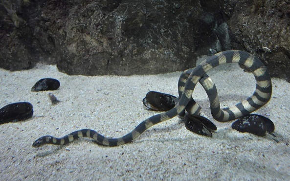 Merikäärmeillä on hämmästyttävä kaksoishengitysjärjestelmä. yli veden pinnan he hengittävät sieraimien läpi keuhkojen avulla ja edelleen sulavat veteen liuenneen hapen limakalvon läpi suuontelon kuori.