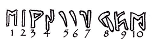 Valokuvia avoimista lähteistä. SI ohjeellinen pronomini löytyy venäjän, etruskien ja lycian kielillä. Yhdeksäs merkki – tämä on kirjain K. Samanlainen oikeinkirjoitus löytyi etruskien tekstistä Steinberg [5]. Toisin sanoen huomautetut vivahteet kirjekaaviossa eivät ole ovat erityisiä, paikallisia, niitä löytyy muut naapurimaiset ja ei niin aakkoset. Viimeisessä kirjaimessa M alla viiva menee hänen oikeaan jalkaansa ja se keskeytetään (katso kuva 1). voi olla tilanpuutteen vuoksi he yrittivät kirjoittaa MN: n ligatuurin (silloin viimeinen sana oli tarkoitus lukea nimellä KMN).